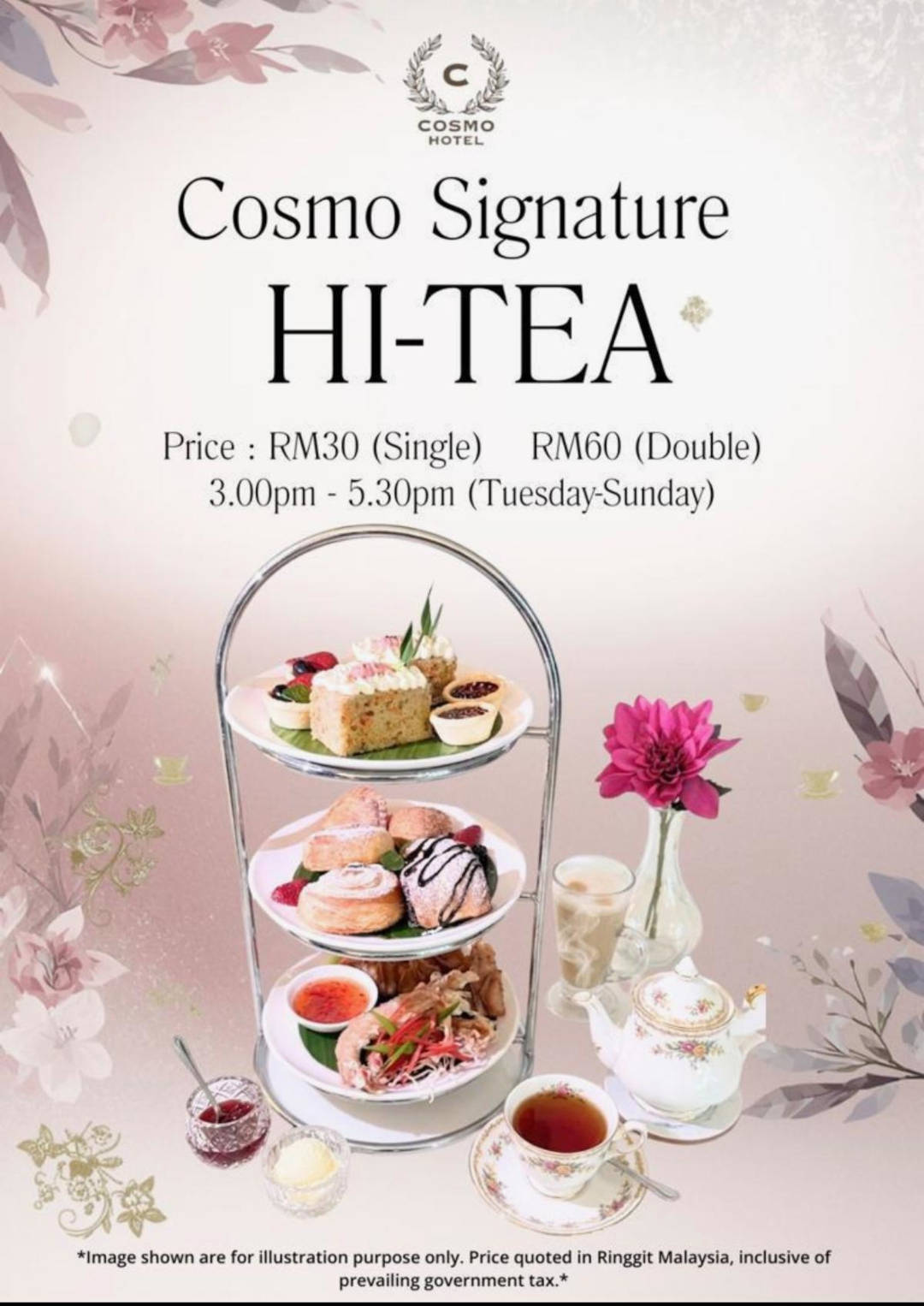 PROMOTIONS - FOOD COSMO SIGNATURE HI-TEA Tuesday to Sunday (3 PM to 5 PM) Price : RM30 ( Single ) RM60 ( Double ) For Booking, Call or WhatsApp: Tel: +6016 896 0165 / +6016 203 1797 BACK