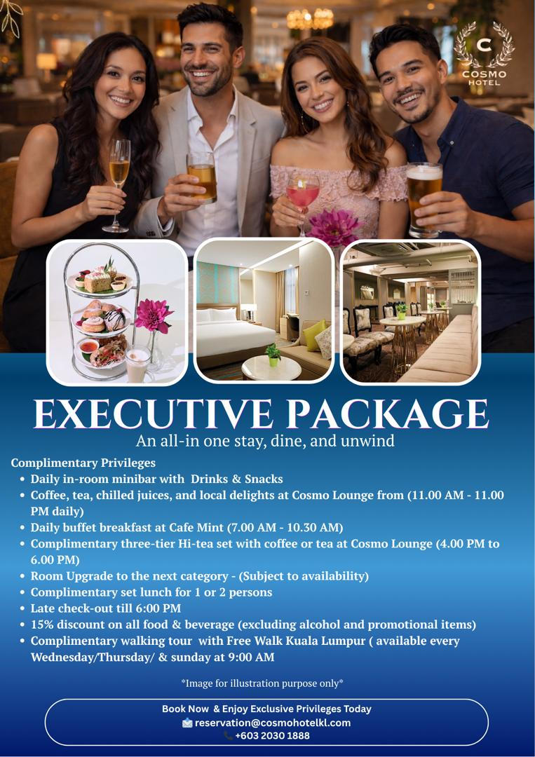 - Complimentary three-tier Hi-tea set with coffee or tea at Cosmo Lounge (4.00 PM to 6.00 PM)